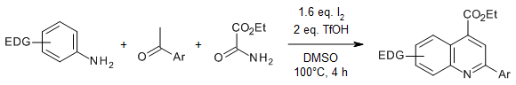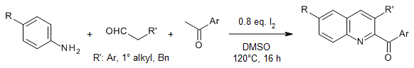 A synergistic I2/amine promoted formal [4+2] cycloaddition of methyl ketones, arylamines, and aryl(alkyl)acetaldehydes provides various 2-acyl-3-aryl(alkyl)quinolines via an iodination/Kornblum oxidation/Povarov/aromatization sequence. Notably, the arylamine reactants also acted as indispensable catalysts to promote enamine formation.