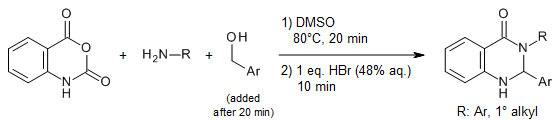 The reaction between isatoic anhydride, primary amines, and benzylic alcohols in the presence of HBr in DMSO at 80°C affords 2,3-dihydroquinazolin-4(1H)-ones in excellent yields via a metal-free oxidative C(sp3)-N coupling process.