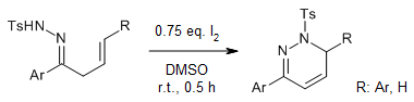 Iodine catalyzes a highly efficient and chemoselective oxidative annulation of β,γ-unsaturated hydrazones to produce 1,6-dihydropyridazines under mild conditions. When active β,γ-unsaturated hydrazone compounds containing electron-donating groups, such as furyl, thienyl, and cycloalkyl, were used, pyrroles were obtained.