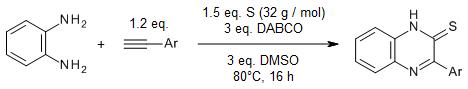 DABCO serves as a sulfur-activating catalyst to achieve the sulfurative 1,2-diamination of phenylacetylenes with elemental sulfur and o-phenylenediamines in the presence of DMSO as terminal oxidant. This cascade three-component reaction is triggered by the addition of active sulfur species to the triple bond of phenylacetylenes.