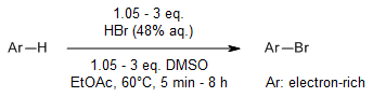 DMSO as a mild and inexpensive oxidant enables an efficient and practical bromination and iodination of arenes with HX (X = Br, I) reagents. This oxidative system is amenable to late-stage bromination of natural products and kilogram-scale conversions.