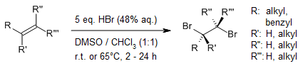 In an oxidative bromination of alkenes to 1,2-dibromo alkanes with HBr, dimethyl sulfoxide serves as the oxidant as well as cosolvent. Whereas simple olefins are brominated in very good yields, three of six styrene derivatives yielded bromohydrins under the reaction conditions.