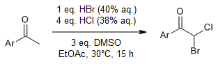 The combination of dimethyl sulfoxide, HCl, and HBr enables a mild, efficient, and practical geminal heterodihalogenation of methyl ketones. This convenient method might be useful for the assembly of bromochloromethyl groups in drug discovery.