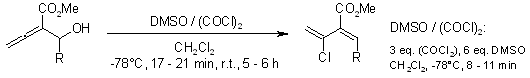 Highly regio- and stereoselective reactions of readily available 2-(methoxycarbonyl)-2,3-allenols with oxalyl chloride in the presence of Et3N or DMSO afforded methyl 2-(ethynyl)alk-2(E)-enoates and 2-(1′-chlorovinyl)alk-2(Z)-enoates, respectively, in good yields.