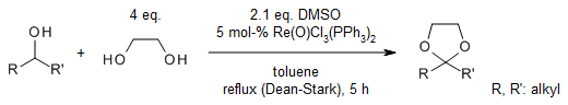 ReOCl3(PPh3)2 catalyzes a rapid oxidation of secondary alcohols by DMSO in the presence of ethylene glycol and refluxing toluene to provide the corresponding ketals in very good yields. Methyl sulfide and water as byproducts of the reaction are easily removed.