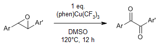 A sequential dehydrogenation and transfer oxygenation of 1,2-diarylepoxides by high-valent phenCu(III)(CF3)3 and DMSO provides 1,2-diketones. In situ generated CF3 radicals abstract the hydrogen atom of the epoxide ring. The resulting ether α-carbon radical undergoes ring-opening rearrangement to give a ketone α-carbon radical intermediate, which is oxygenated by DMSO.