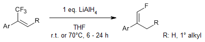 The stereoselective hydrodefluorination of trifluoromethylated alkenes with LiAlH4 yields terminal monofluoroalkenes in excellent yields and diastereoselectivities. Mechanistic investigations indicate that the reaction proceeds through a hydroalumination step, followed by a stereoselective fluoride elimination.