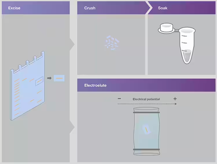 Electroelution methods use an electric field to remove nucleic acids from the gel matrix. A simple method is to place the cut band inside a dialysis membrane with a small molecular weight rejection value. Subsequently, the dialysis membrane containing the gel slice was subjected to electrophoresis to elute the nucleic acid from the gel.