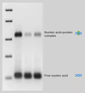 The electrophoretic migration rate of nucleic acid fragments bound to proteins is slower than that of unbound fragments, formally known as electrophoretic mobility change analysis (EMSA). Methods based on this principle are often referred to as gel shift or gel arrest assays, because bound proteins shift or delay the migration gel of nucleic acid fragments (FIG. 7). Therefore, the electrophoresis step of the experiment can "snap" the balance of bound and free DNA in the sample. For EMSA, low ionic strength buffers should be used in gel preparation and electrophoresis to help stabilize nucleic acid-protein complexes during electrophoresis.
