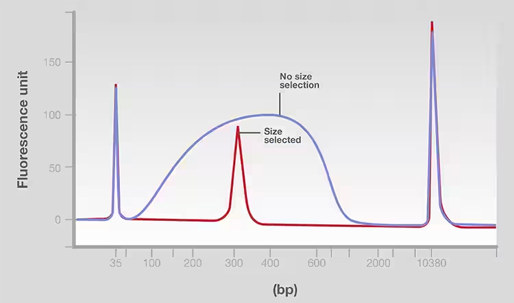 For platforms, samples were fragmented, end-modified and ligated to adaptors as part of sequencing library preparation. After these steps, DNA fragments of a specific size range (for example, 200 to 300bp) are purified in a process known as size selection to remove not only the low and high molecular weight fragments, but also the adaptors, enzymes, and reagents from the previous steps. Fragment screening helps ensure that input samples have fragments of uniform length, thus achieving high-quality and consistent sequencing [1]. Gel electrophoresis is a method of size selection because of the efficiency of selecting segments of specific size in a narrow range (FIG. 8).