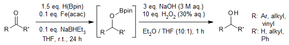 An operationally convenient hydroboration of aldehydes and ketones using Fe(acac)3 as a precatalyst proceeds efficiently at room temperature, yielding 1° and 2° alcohols after workup. A σ-bond metathesis mechanism involving an Fe-H intermediate as the key reactive species is proposed.