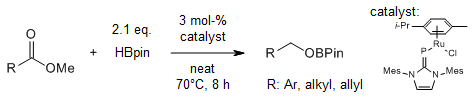 The ruthenium complex [(η6-p-cymene){(IMes)P}RuCl] is utilized for efficient hydroborations of a wide range of nitriles, carboxylic esters, and carboxamides in neat pinacolborane (HBpin) under relatively mild reaction conditions (60-80 °C, 3-5 mol % catalyst loading).