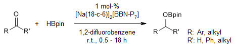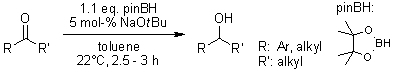 The reduction of ketones employing pinacolborane is accelerated by NaOt-Bu at room temperature. This reaction yields substantial amounts of product and is generalizable, achieving complete conversion of aryl and dialkyl ketones. The active hydride source is trialkoxyborohydride, which is believed to be present at low concentrations under the reaction conditions.