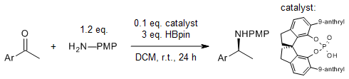 SPINOL-derived borophosphates catalyze an asymmetric reductive amination of ketones with pinacolborane to yield a series of chiral amine derivatives bearing multiple functional groups in very good yields and enantioselectivities under mild reaction conditions.