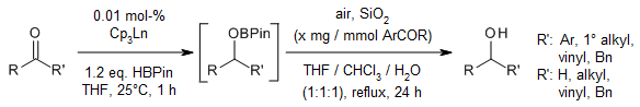Homoleptic cyclopentadienyl lanthanide complexes are excellent catalysts for the hydroboration of various aldehydes and ketones with pinacolborane. These robust lanthanide catalysts exhibit high reactivity with low catalyst loadings under mild conditions, good functional group tolerance, and unique carbonyl-selectivity.