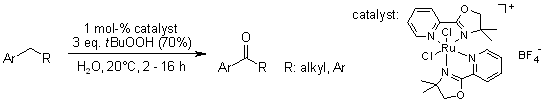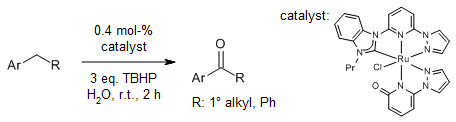 Ru complexes with tridentate hybrid ligands showed a very strong catalytic activity in water at room temperature for benzylic C-H oxidation. Whereas NHCs with a stronger donor ability stabilize the Ru center; nitrogen ligands with a relatively weaker donor ability release from the Ru center, so that they induce a reaction.