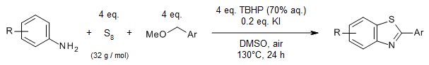 A selective, TBHP/KI-promoted C-O bond cleavage of ethers followed by annulation with anilines and elemental sulfur provides a wide range of 2-aryl-, 2-heteroaryl-, and 2-alkyl-substituted benzothiazoles with satisfactory yields and good functional group compatibility under transition-metal-free conditions.