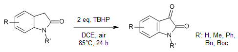 Recombination of alkyl radicals derived from indolin-2-ones with the tert-butylhydroperoxy radical affords 3-(tert-butylperoxy)indolin-2-one intermediates that can be further transformed into indoline-2,3-diones under air. This strategy provides a simple, effcient, and metal-free route to indolinediones.