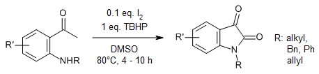 The use of a catalytic amount I2 and TBHP as stoichiometric oxidant enables a simple and atom economic one-pot synthesis of isatins from 2′-aminoacetophenones via oxidative amido cyclization of the sp3 C-H bond. In the presence of a stoichiometric amount of iodine, the reaction yields iodoisatines. The reaction proceeds through sequential iodination, Kornblum oxidation, and amidation in one pot.