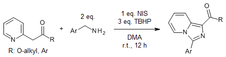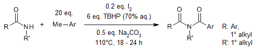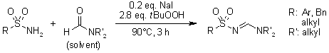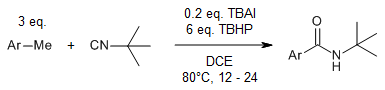 In an unusual oxidative coupling reaction of isocyanide and toluene derivatives using tetrabutylammonium iodide (TBAI) as a catalyst, the isocyano group acts formally as an N1 synthon, thus expanding the reactivity profile of isocyanides.