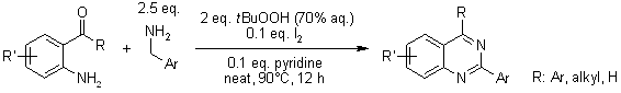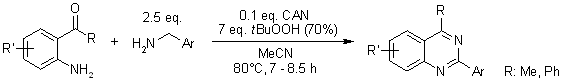 A facile and efficient method for the synthesis of 2-phenylquinazolines from 2-aminobenzophenones and benzylamines us catalyzed by ceric ammonium nitrate (CAN)-TBHP in acetonitrile. The corresponding 2-phenylquinazolines were obtained in good to excellent yields.