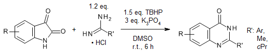 A synergetic tert-butyl hydroperoxide/K3PO4-promoted oxidative cyclization enables a facile synthesis of various functionalized quinazolin-4(3H)-ones from commercially available isatins and amidine hydrochlorides at room temperature.