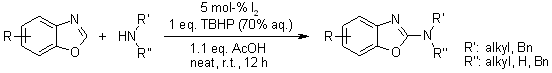 A facile metal-free oxidative amination of benzoxazole by activation of C-H bonds with secondary or primary amines in the presence of catalytic iodine in aqueous tert-butyl hydroperoxide proceeds smoothly at ambient temperature under neat reaction condition to furnish products in high yields. This user-friendly method produces only tertiary butanol and water as byproducts.