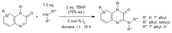 A metal-free cross-dehydrogenative coupling between quinoxalinones and amines in the presence of catalytic iodine and aqueous tert-butyl hydroperoxide as the terminal oxidant provides 3-aminoquinoxalinones in good yields in dioxane as solvent. The reaction is highly versatile and exhibits good functional group tolerance with a range of primary and secondary amines.