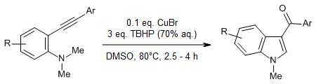 Cu-catalyzed sp3 C-H bond activation α to the nitrogen atom of o-alkynylated N,N-dimethylamines followed by an intramolecular nucleophilic attack with the alkyne, using an aqueous solution of tert-butyl hydroperoxide (TBHP) as the oxidant, enables a tandem catalytic synthesis of 3-aroylindoles. In this synthesis, both C-C and C-O bonds are installed at the expense of two sp3 C-H bond cleavages.