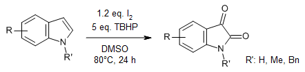 An I2/TBHP-mediated oxidation of commercially available indoles affords isatins in moderate to good yields.