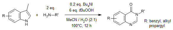 An n-Bu4NI-catalyzed reaction of 3-methylindoles with primary amines using TBHP as the unique oxidant provides broad range of quinazolinones in very good yields. The reaction involves oxygenation, nitrogenation, ring-opening, and recyclization.
