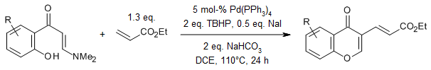 Reactions between readily available o-hydroxyphenyl enaminones and various alkenes enable a a step economical and general synthesis of 3-vinyl chromones.
