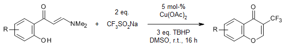 The use of the Langlois reagent enables an efficient and regioselective synthesis of various 3-(trifluoromethyl)chromones from enamino ketones. This convenient procedure offers high product purity and yield.