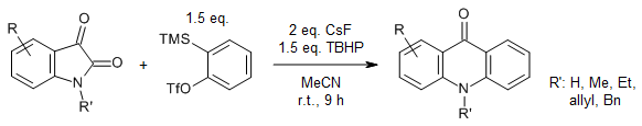 Tert-Butyl hydroperoxide promotes an oxidative annulation reaction of isatins with 2-(trimethylsilyl)aryl triflates for the convenient synthesis of acridone derivatives. The reaction may proceed via consecutive Baeyer-Villiger-type rearrangement followed by an intermolecular cyclization. This convenient method offers broad substrate scope and good functional group tolerance.