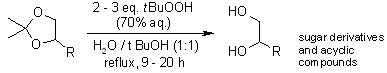 Aqueous tert-butyl hydroperoxide (70%) is an inexpensive reagent for the regioselective and chemoselective deprotection of terminal acetonide groups. Various acetonide derivatives furnish the corresponding deprotected diols in good yields, while a large number of acid labile protecting functional groups and other functional moieties were found to be unaffected under the conditions.