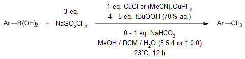 A mild and practical protocol for the copper-mediated trifluoromethylation of aryl and heteroaryl boronic acids using NaSO2CF3 (Langlois’ reagent) and TBHP proceeds at room temperature under ambient conditions. The products can be readily purified by extraction or column chromatography.