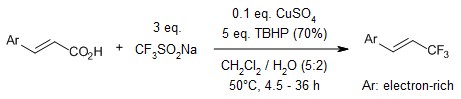 A copper-catalyzed decarboxylative trifluoromethylation of various α,β-unsaturated carboxylic acids was achieved by using a stable and inexpensive solid, sodium trifluoromethanesulfinate (CF3SO2Na, Langlois reagent). In addition, an iron-catalysis enables a difluoromethylation of aryl-substituted acrylic acids by using zinc difluoromethanesulfinate (DFMS, (CF2HSO2)2Zn, Baran reagent) via a similar radical process.