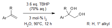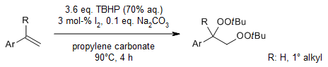 Iodine catalyzes an environment-friendly and efficient dioxygenation of aryl alkenes for the construction of vicinal diols in water as solvent with tert-butylhydroperoxide (TBHP) as the oxidant. The protocol is efficient, sustainable, and operationally simple. In addition, bisperoxides could be obtained in good yields with Na2CO3 as additive and propylene carbonate as solvent.