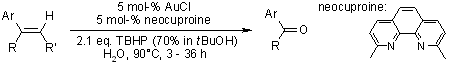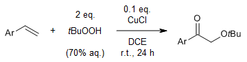 A practical and environmentally friendly oxidation of aryl olefins to arylethanone derivatives by using a Cu(I) catalyst and tert-butyl hydroperoxide (TBHP) provides 2-tert-butoxy-1-arylethanones in good yields under mild conditions with high selectivity. In this method, TBHP acts not only as an oxidant but also as the tert-butoxy and carbonyl oxygen sources.