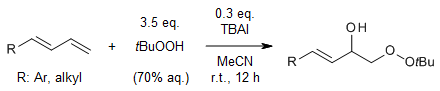 TBAI catalyzes an efficient, mild, and regioselective synthesis of 4-aryl/alkyl-1-peroxy-but-3-en-2-ols in good yields from 1-substituted-1,3-butadienes in the presence of hydroperoxides and water. This regioselective orthogonal dioxygenation of a diene can be executed in a simple operation and tolerates a wide range of substrates.