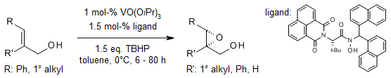 Chiral amino acid-based hydroxamic acids can be effective asymmetric catalysts for the epoxidation of allylic alcohols, especially disubstituted allylic alcohols. The mild reaction conditions, e.g., reasonable temperature, low degree of catalyst loading, and halogen-free solvent, extend the scope of this process.