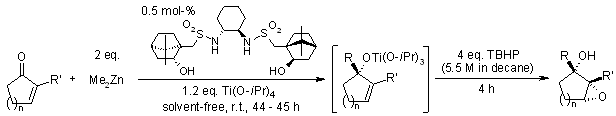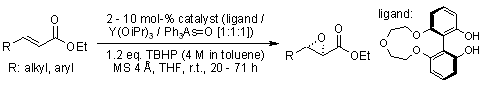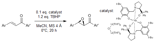 Heterobimetallic complexes stabilized by chiral phenoxy-functionalized prolinolate are highly active in catalyzing the epoxidation of α,β-unsaturated ketones, while the enantioselectivity varies according to the ionic radii of the rare earth center. A series of chalcone derivatives were converted to chiral epoxides in good ee at 0°C using TBHP as the oxidant.