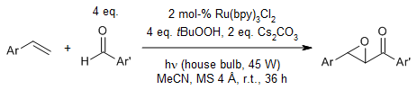 Under the synergistic actions of photocatalyst Ru(bpy)3Cl2, tert-butyl hydroperoxide, cesium carbonate, and visible light irradiation, a range of styrenes and benzaldehydes smoothly form α,β-epoxy ketones via visible-light-enabled photocatalytic generation of acyl radicals as key intermediates.