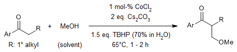 A cobalt-catalyzed α-methoxymethylation of ketones with methanol as a sustainable C1 source, cheap CoCl2·6H2O as catalyst and TBHP as oxidant provides the methoxymethylated products within a short reaction time in very good yield. α-Aminomethylated ketones can be produced by a one-pot methylenation/aza-Michael addition sequence or by a base-mediated conversion of the α-methoxymethyl ketones.