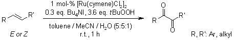A ruthenium-catalyzed oxidation of alkenes allows an efficient route to α-diketones using TBHP as an oxidant, is highly functional group tolerant and practically convenient, requires no additional ligand, and operates under mild conditions with short reaction times. Based upon experimental observations, a plausible mechanism is proposed.
