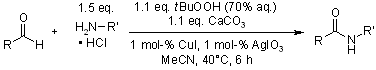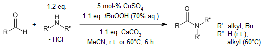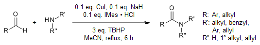 The combination of copper(I) iodide and an N-heterocyclic carbene catalyzes an oxidative amidation of aldehydes with amines in the presence of tert-butyl hydroperoxide. The method is simple and practicable, has a broad substrate scope, and uses economical, feasible, and abundant reagents.