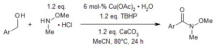 The use of tert-butyl hydroperoxide as an oxidant and an inexpensive and air stable copper catalyst enables a simple and efficient protocol for the oxidative amidation of commercially affordable alcohols to Weinreb amides in very good yields. The reaction tolerates various functional groups.