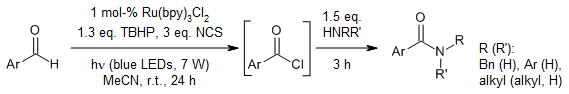 Using an efficient visible-light photocatalysis-based method, a mixture of an aldehyde, tert-butyl hydrogen peroxide, and N-chlorosuccinimide afforded an acid chloride in the presence of Ru(bpy)3Cl2 as photocatalyst. A subsequent reaction with an amine provided the corresponding amide.