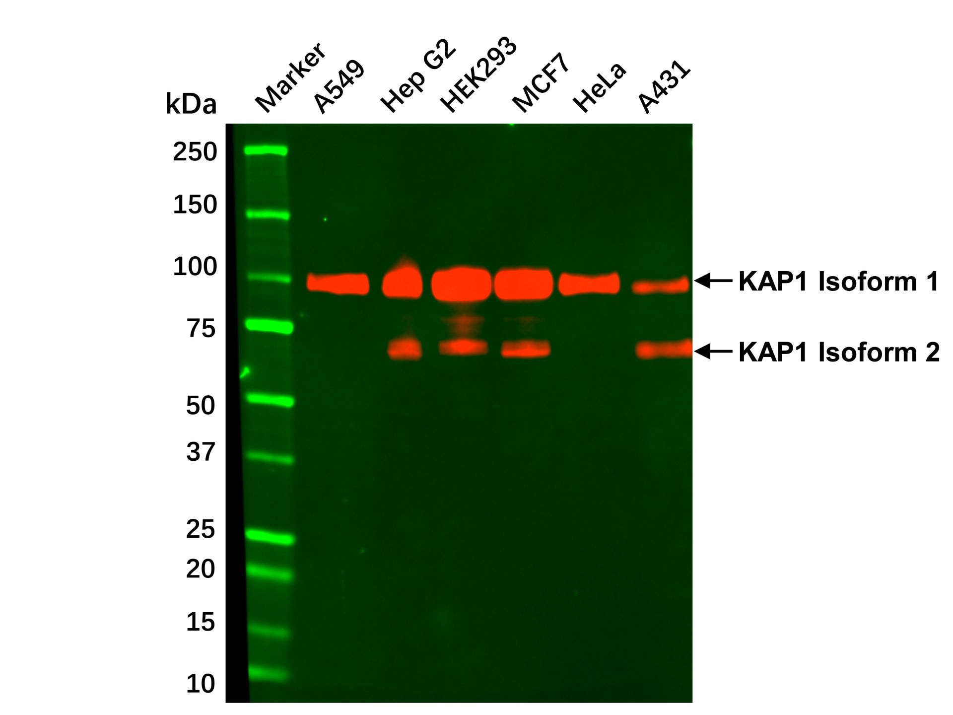 Mouse anti Human KAP1 Antibody, 4E1-D12-F8, could be used for WB, IHC-F, IHC-P, ICC/IF, IP and so on. |