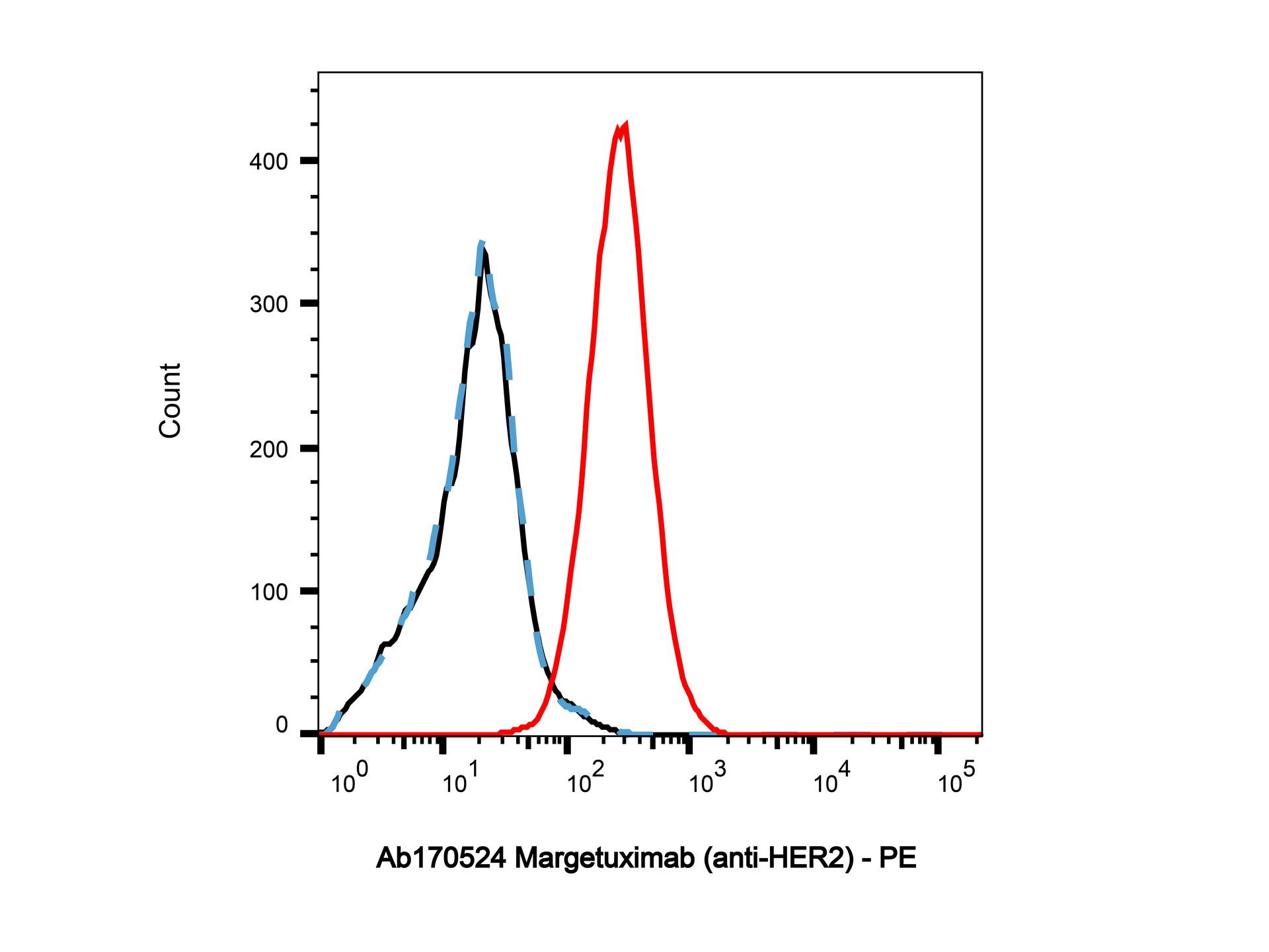 Flow Cytometry analysis of MCF-7 cells labelling HER2 (red) with Margetuximab (anti-HER2) (Ab170524). Goat Anti-Human IgG (PE) (Ab175838) at a dilution of 1/1000 was used as the secondary antibody. Blue - Isotype control, human IgG (Ab170213). Black - Unlabelled control, cells without incubation with primary antibody.